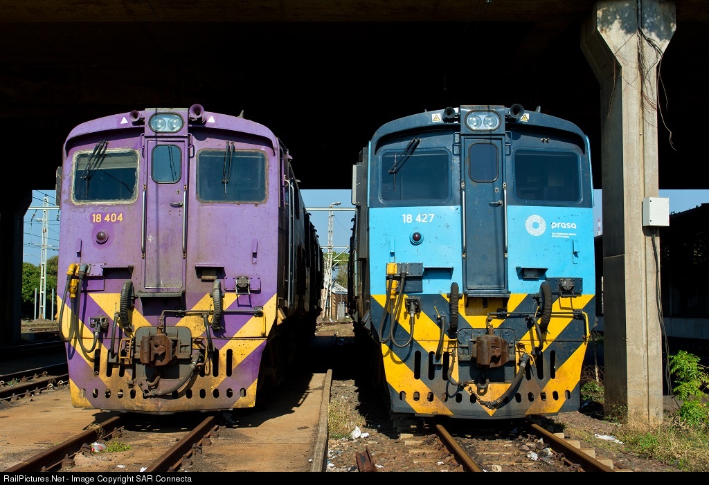 | 18-404 and 18-427 (with their paired running mates behind them), are occupying their usual spot when staged in Durban under the Argyle Road Bridge, in between mainline passenger train workings. It seems that the "purple" Shosholoza Meyl livery is already giving way to the PRASA "blue" livery with a couple of repaints having already been seen. |