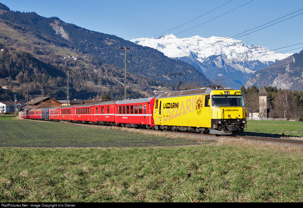 | Ge 4/4 III 644 painted in the publicity paint scheme for Lazzarini, a big construction company, is pulling the RE 1141 from Chur to St. Moritz. |