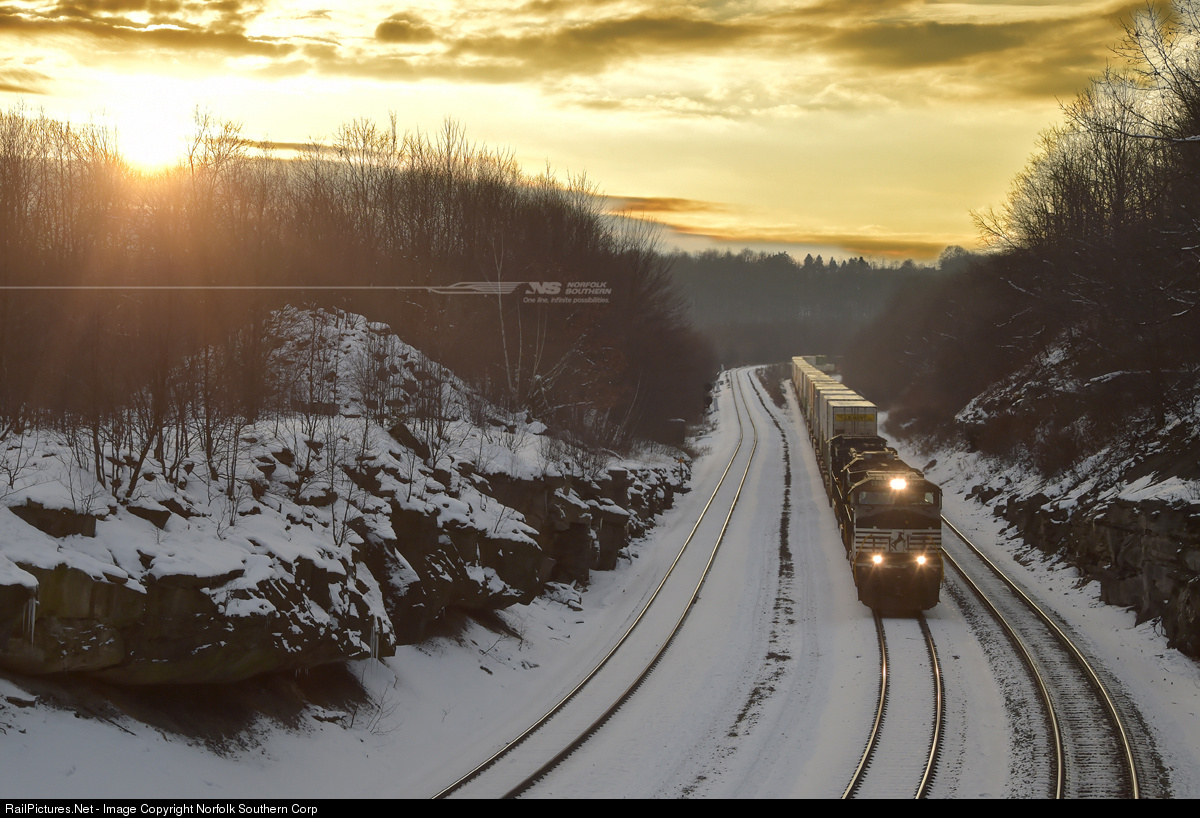 Approaching Bennington Curve near Gallitzin, Pennsylvania, doublestack train 20T (Kansas City-Harrisburg) glides downgrade on track two. NS crews worked hard to keep the freight moving during this year's peak intermodal season, even amidst several early snow storms. Photo by Casey Thomason. For more information about Norfolk Southern, visit www.nscorp.com