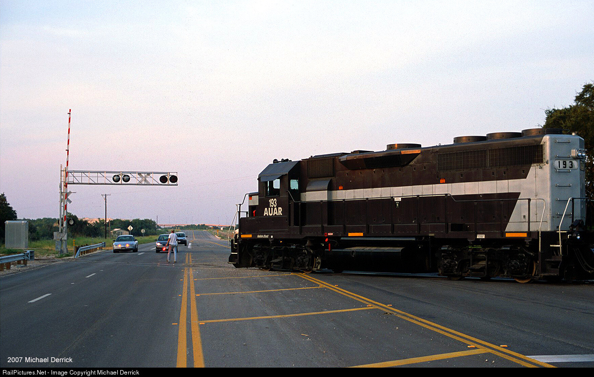 A late summer afternoon finds Austin Area Terminal Railroad (AUAR) Gandy Turn heading north from McNeil, crossing Highway 171 under the conductor's protection because gates have just been installed but not yet activated. EconoRail would not operate the AUAR much longer past this photo, and the Capitol Metro commuter rail (which drove the gate installation in part) would soon affect freight operations, driving them to nighttime hours.