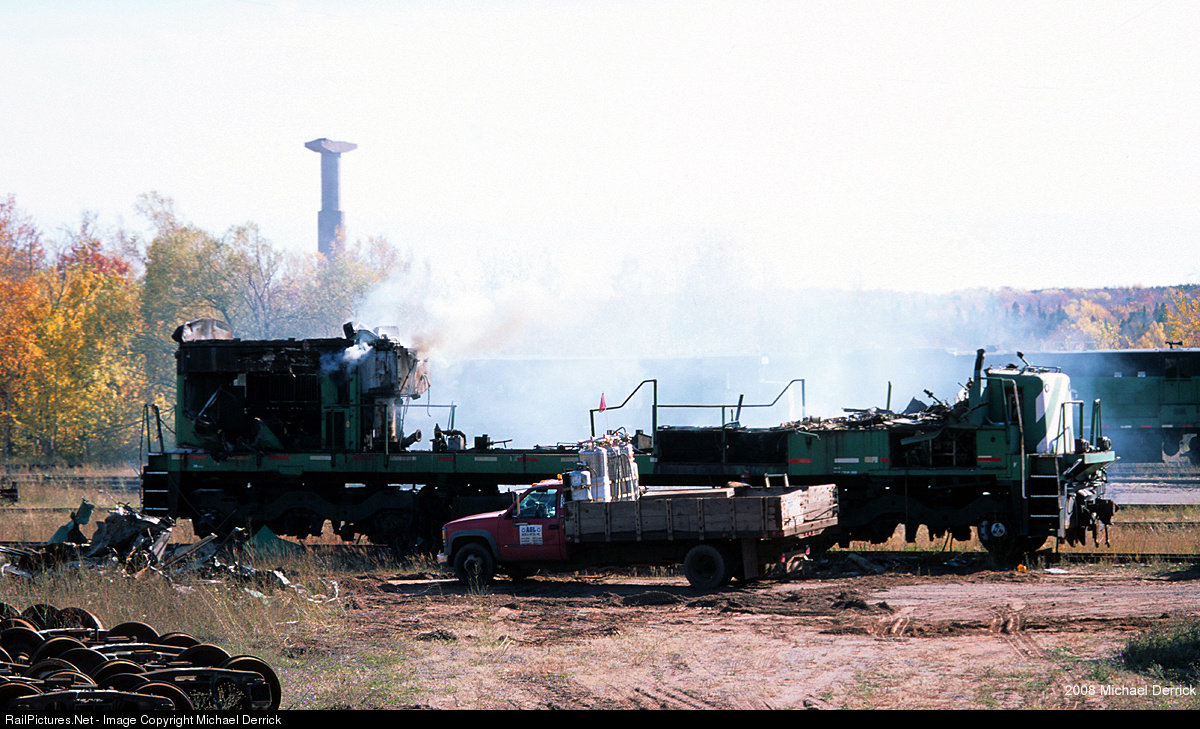 | In a scene which depicts where older GE fans stand in today's modern railroading scene, LSI 3002 is reduced to a burning pile of rubbish at the Lake Superior & Ishpeming's shop in Eagle Mills, MI. GE fans will have a much easier time locating an Alco than a U-series today, something likely unfathomable when secondhand U-boats were plentiful. |