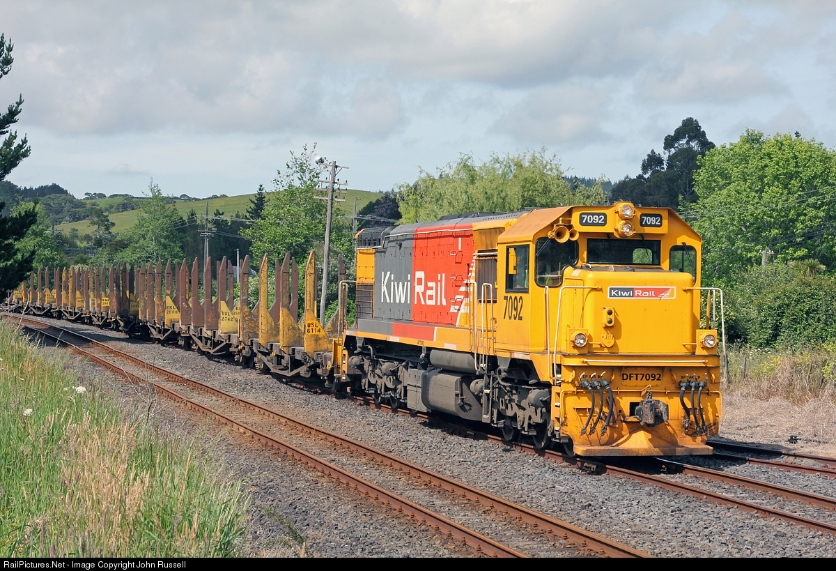 | DFT 7092 heads north to Whangarei with empty log train 125. The 200km North Auckland Line passes through 13 tunnels and is rustic and scenic. Sadly it is under threat of closure due to light traffic and high costs. The first four tunnels are about 120 years old and restrict use of hi-cube containers without special wagons. |
