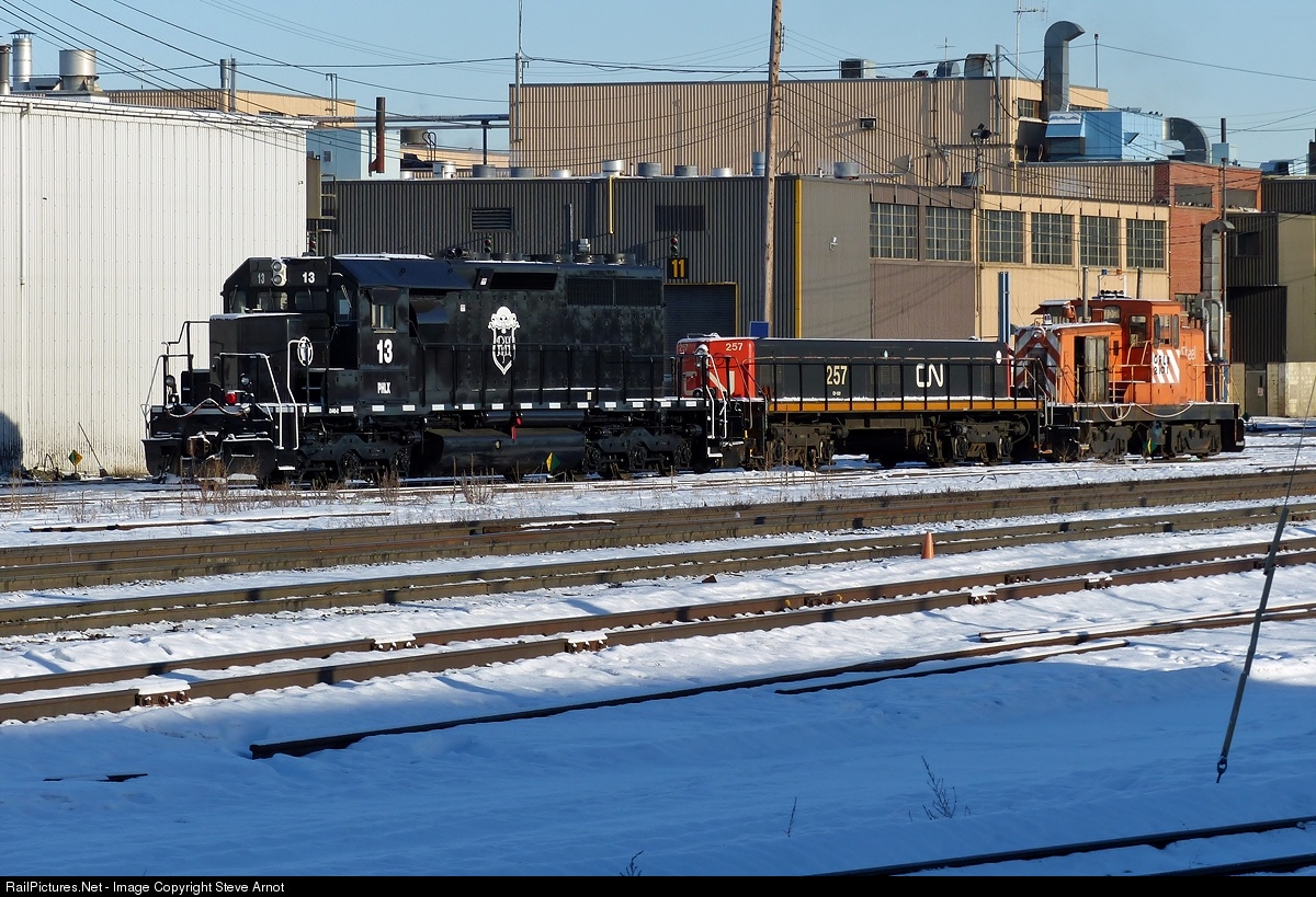 Parrish and Heimbecker SD40-2 13, GP9 Slug 257 and ex-Altasteel/Stelco GE 80T 52 parked at CN's Walker Yard.