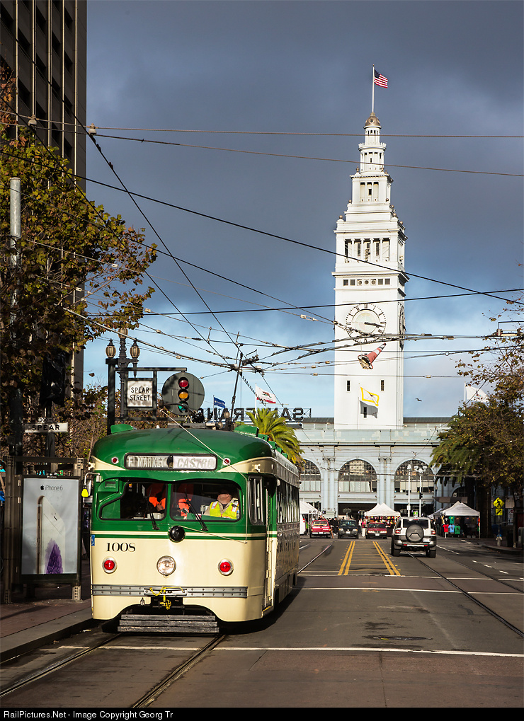 Last picture of my US trip, on the way to the SFO airport when changing from the F-Line to BART in the Market Street. PCC streetcar # 1008 dates back to 1948 when it was delivered by St.Louis Car Co. to San Francisco, where it ran since then. Now again in the original paint scheme from the 1940'. In the background the clocktower of the impressive Ferry Building from 1898.