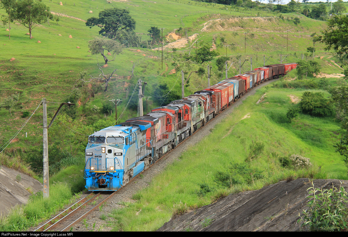 | Northbound empty X97 headed by Rumo AC44i #9838 approaching the Tapera Tunnel, at region of Itu-SP. This is one of the few sections of the exportation corridor that are not double track yet, because of the tunnels. |