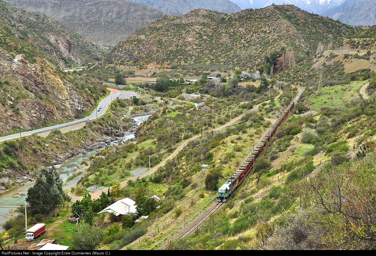 | Former trasandine railway line between Los Andes (FCTC Chile) and Mendoza (FCTA Argentina) over the great Andes mountain (closed in 1984 except the section Los Andes - Rio Blanco which remains open to serve a CODELCO Andina copper mine located in Saladillo, Rio Blanco), train of FEPASA #50.983 bordering the canyon of Aconcagua river between Los Andes and Vilcuya. |