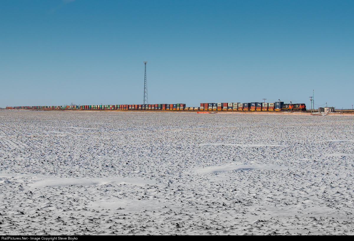 An eastbound CN intermodal train stretches across the frozen prairie.