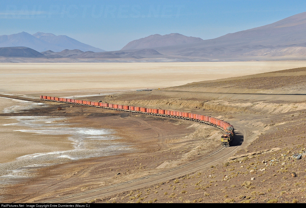 | October 2013, a small part of Carcote salt lake viewed from the San Martin slope. After crossing a long straight, in the middle of the great Carcote salt lake, FCAB ore train coming from Ollague and final destination Angamos seaport in Mejillones, upward to Ascotan pass (4000m).