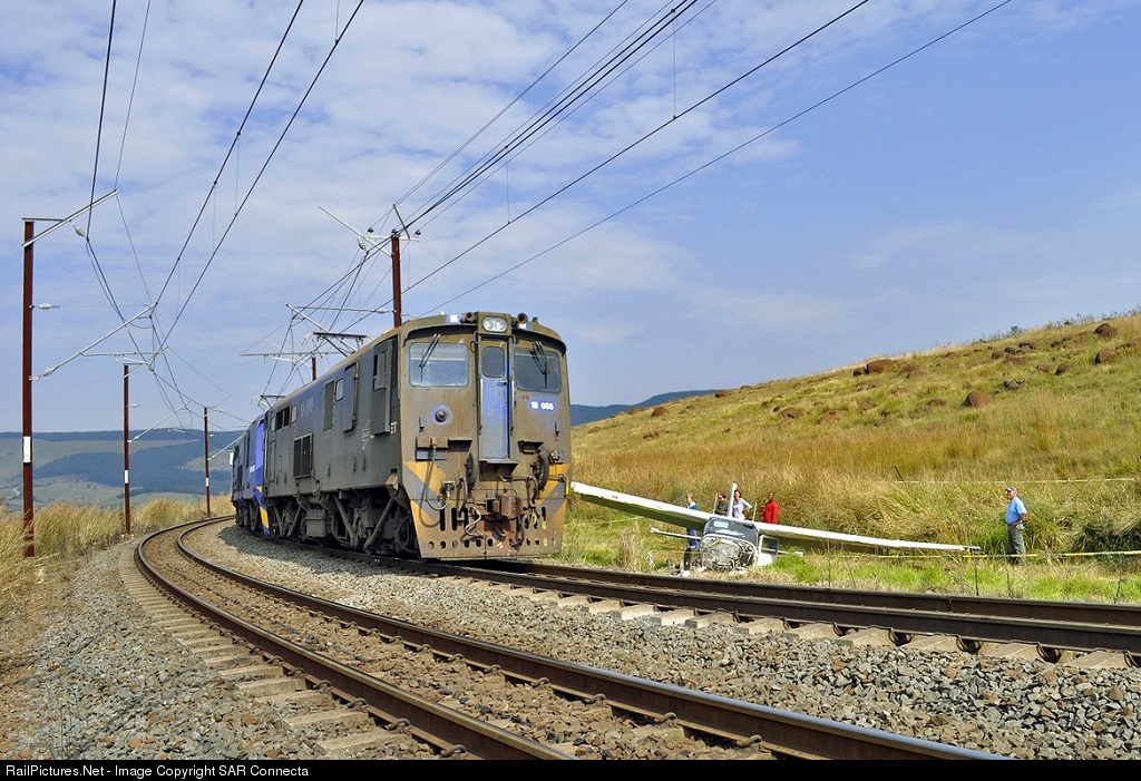 | 18-066 and a cement train pass the wreck of a Cessna, that a bit earlier had overshot the end of a runway on landing at a private airstrip on a farm on top of the hill to the right of the photo and came to rest next to the up line of the Natal Main Line. Pilot and one passenger escaped uninjured. |
