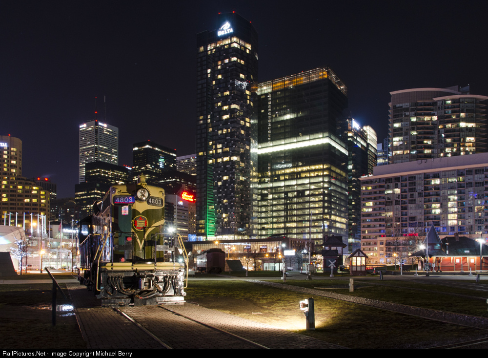 A GP7 and Toronto's skyline. CN 4803 is a GP7 built by GMD in 1953. It is currently owned by the Toronto Railway Historical Association and is on display at the Toronto Railway Heritage Centre. Just to the right of the engine in the distance can be seen the sign for the CP-built Royal York hotel.