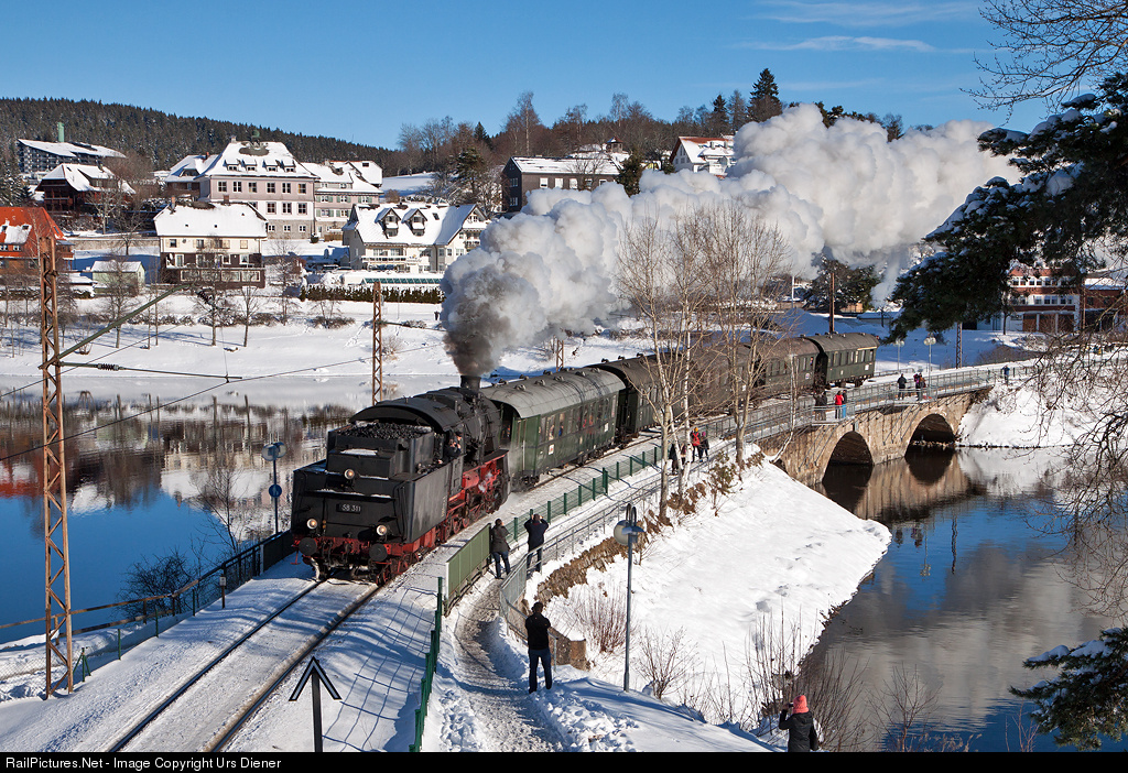 | Winter steam in the black forest organized by the IG 3-Seenbahn. The 1921 built three cylinder steamlocomotive 58 311, operated by the UEF (Ulmer trainfans), on the way from Seebrugg to Titisee. |