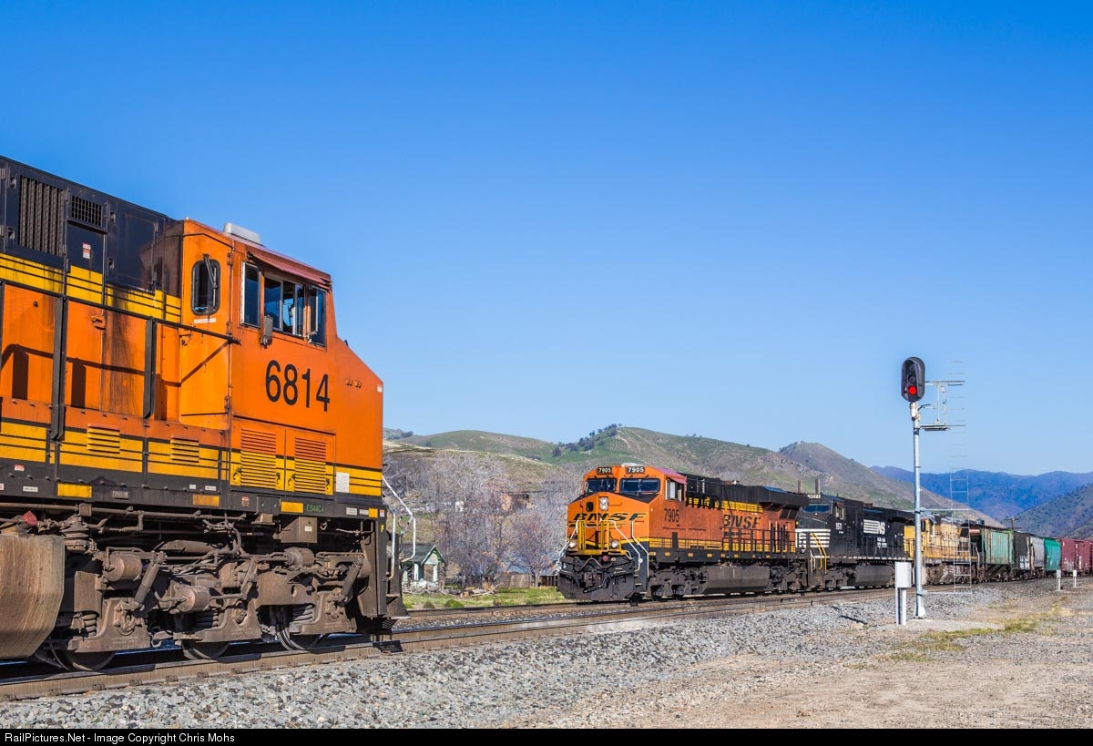 | BNSF 6814 waits on the main for BNSF 7905, coming out of the horseshoe curve at Caliente with a mixed manifest, to clear into the siding. |