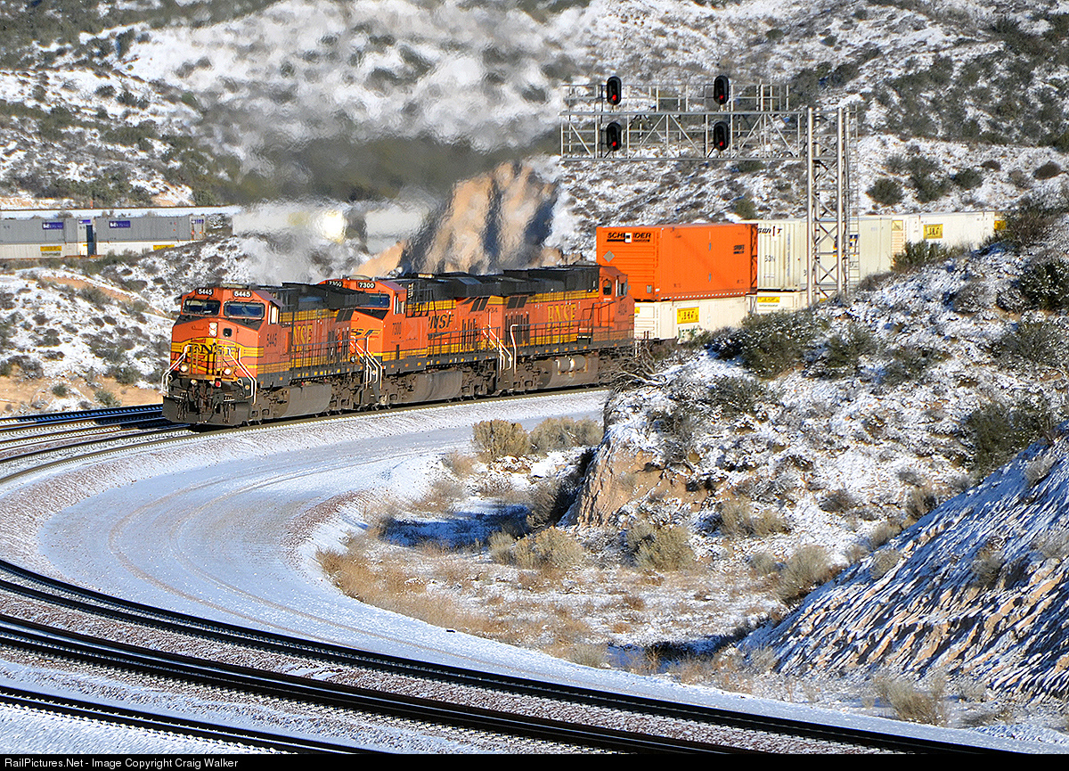 A BNSF Railway intermodal train, Z-SBDALT7-31A (San Bernardino CA to Alliance, TX), is passing through Silverwood and is about to round the curve into Summit as it ascends Cajon Pass, in southern California. A cold winter storm left a blanket of snow before sunrise on this New Year's Eve 2014 - the first snowfall on Cajon this winter. Dash 9-44CW 5445, ES44DC 7300 and Dash 9-44CW 4034 are powering this train.