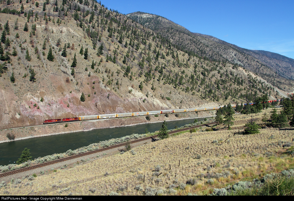 A Canadian Pacific train is westbound on Canadian National trackage along the Thompson River between Spences Bridge and Seddall, British Columbia, on July 23, 2011. In the foreground is the CP main, normally used for eastbound trains in this shared trackage area.