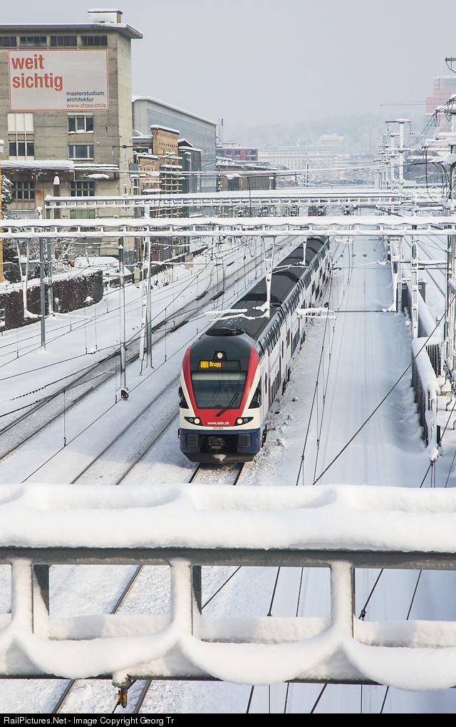 Doubledeck commuter trainset RABe 511 003 in fresh snow leaving Winterthur as S 12 to Brugg (AG).