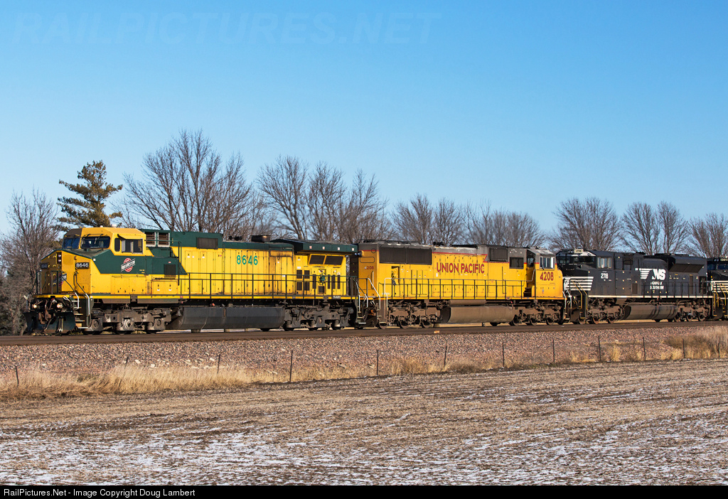 CNW C44-9W 8646 leads, UP SD70M 4208, NS SD70M-2 2718, and NS C40-9W 9729 on Westbound MELNP.