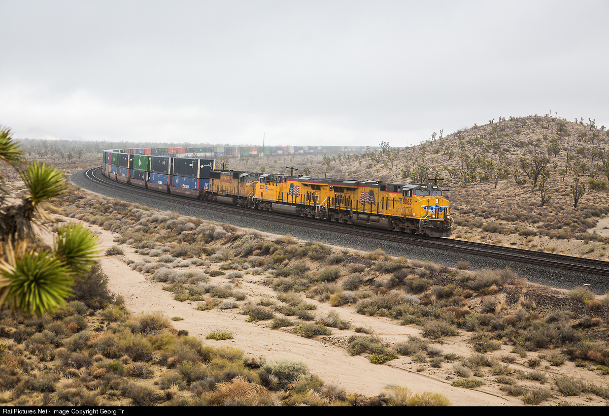 | Union Pacific doublestack slowly beginning the descent over the 18 mile 2.2 % grade down from Cima to Kelso, with ES44AC (classed as C45ACCTE by UP) # 8063 and # 8221 and SD70M # 4083. |
