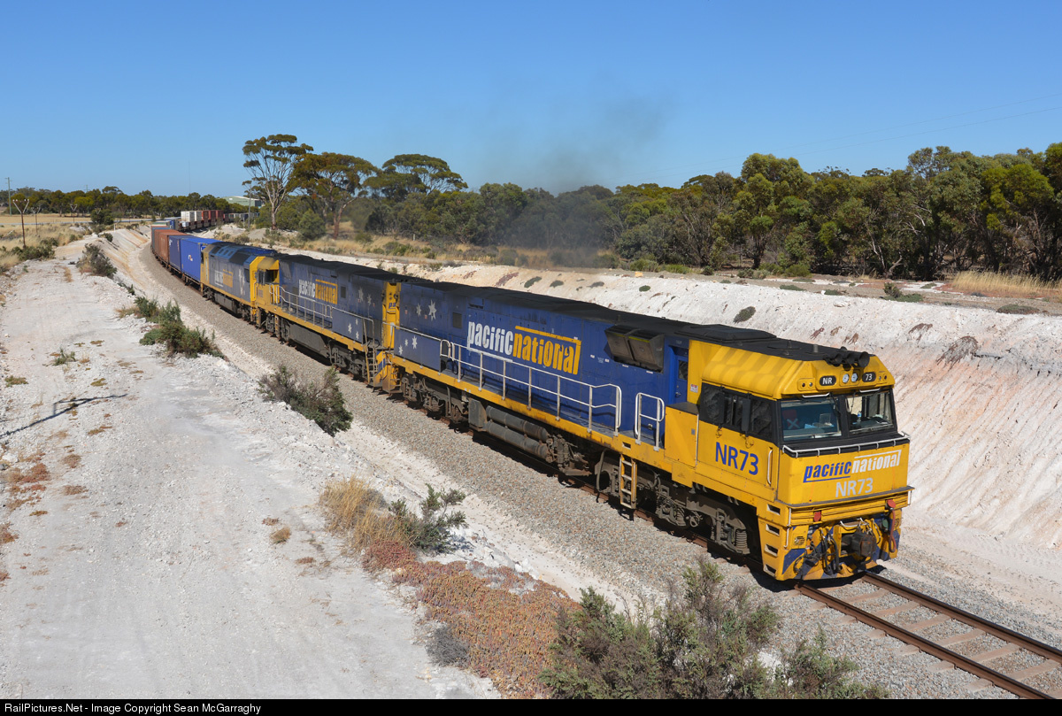 | Normally hauled by a single NR class loco, it was nice for a change to see 7PX4 steel train hauled by NR73, NR88 & AN1 as they round the curve at Meenaar. |