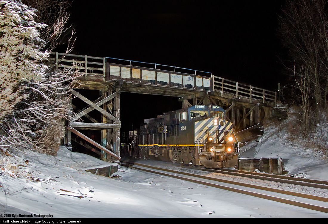 | Winter has finally arrived in Mid-Michigan with the first significant snowfall that will stick for a while. The snow has created a wintry scene for CN L501 as it passes under the steam era wood pile bridge that lifts Newberry Rd. over the line. Lit with 3 Canon Speedlites, 2 430EX II's and one Canon 600EX RT. 1/200, f/4, ISO 1600. |