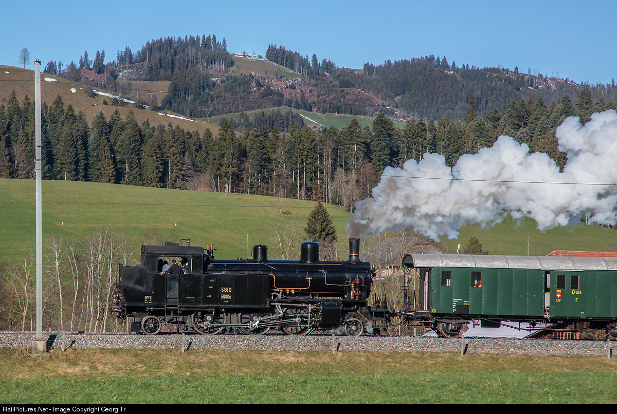 | 2-6-2 T steamlocomotive Eb 3/5 # 5810 of association Dampfbahn Bern (DBB), with a special for the Railway Touring Company from GB, between Schüpfheim and Escholzmatt in the Entlebuch valley. The locomotive was built by SLM Winterthur in 1911 for the SBB, and ran later till 1974 for the Mittel-Thurgau-Bahn. |