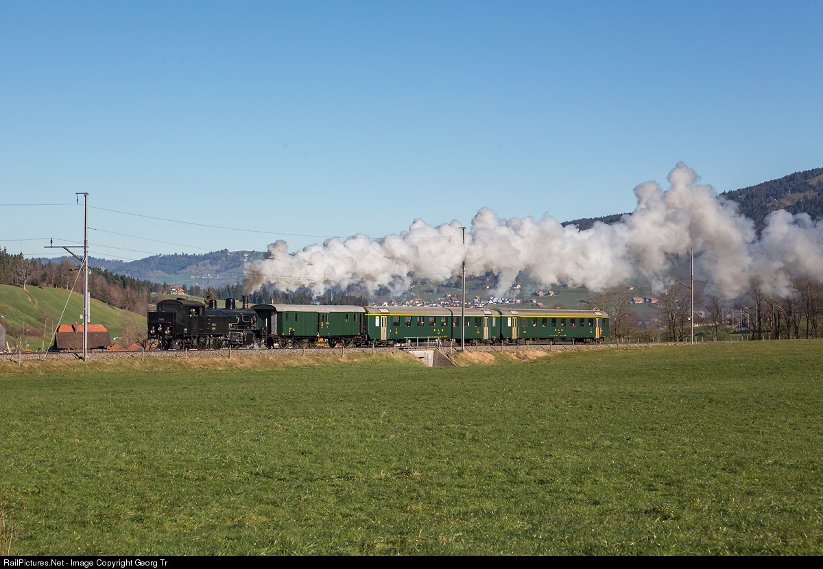 | 2-6-2 T steamlocomotive Eb 3/5 # 5810 of association Dampfbahn Bern (DBB), with a special for the Railway Touring Company from GB, between Schüpfheim and Escholzmatt in the Entlebuch valley. The locomotive was built by SLM Winterthur in 1911 for the SBB, and ran later till 1974 for the Mittel-Thurgau-Bahn. Baggage car F 17124 of DBB and former BLS firstclass standard coach I # 801 and 807, now with extrazug.ch in Langnau. |