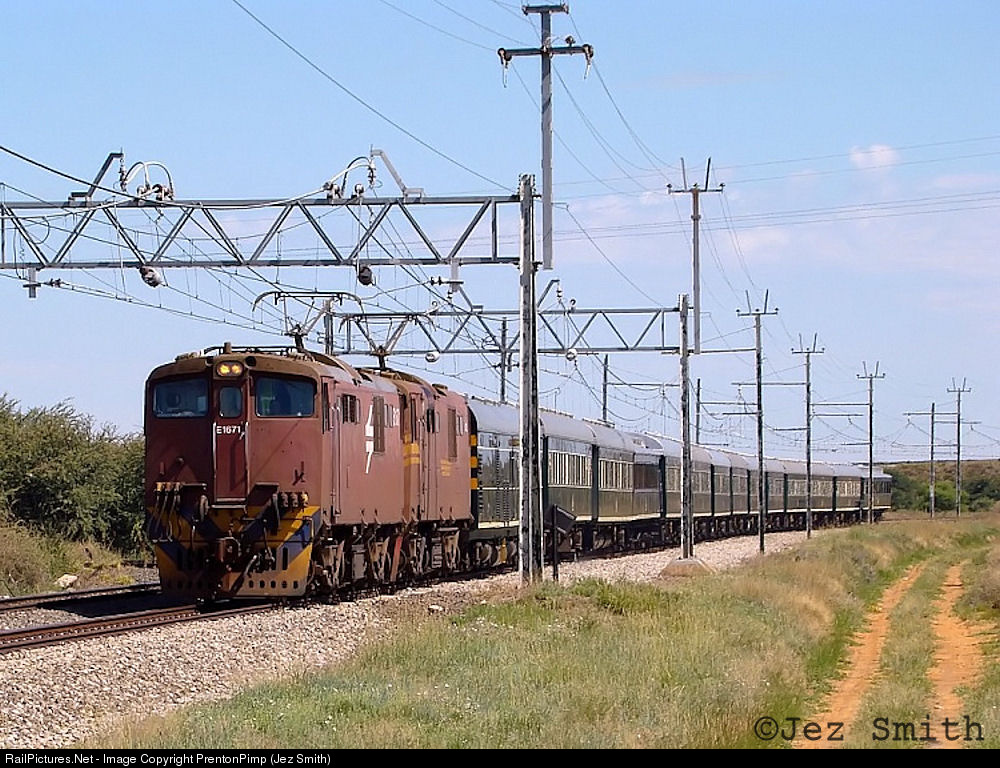 | With around another 10 minutes before arrival at Kimberley, a brace of class 6E1s pass Riverton with a Rovos Rail 'Pride of Africa' train.