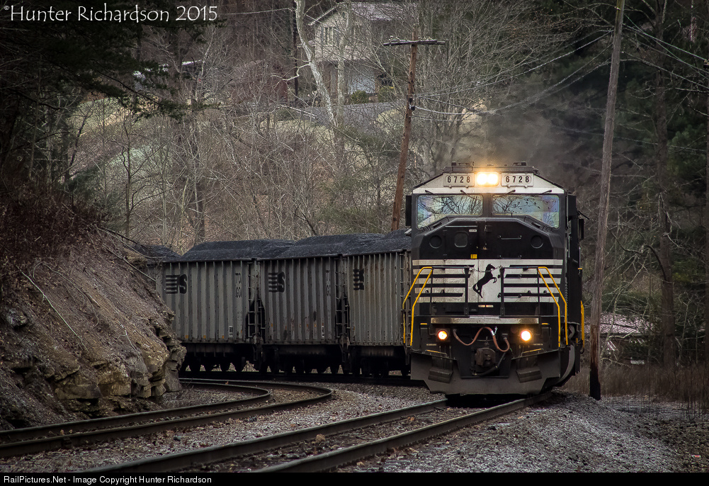 | Shortly after picking up 15 coal loads and adding them to their westbound loaded coke train, NS U60 works around the corner as it approaches Thomas Wye behind a former Conrail EMD. This westbound train would climb the hill, and tie down at Hurley. |