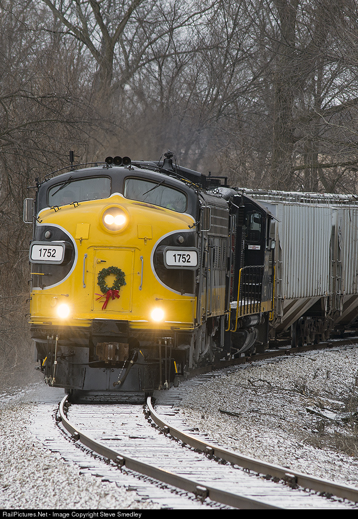 | A Christmas wreath makes up for the lack of a nose herald, as Keokuk Junction Railway 1752 West clears a light coating of snow off the rails. The bells are open on the air horn as engineer Doug Henry signals for the Trivoli Road Crossing West of Glasford, Illinois. |