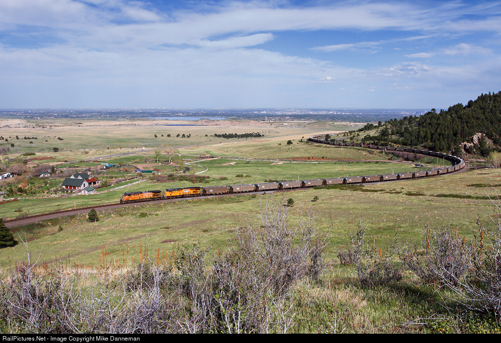Leaving the plains behind, a westbound Union Pacific coal train crosses Blue Mountain Drive west of Eisele, Colorado, and is about to encircle the mouth of Coal Creek Canyon on a relentless 2-percent climb of the Front Range of the Rocky Mountains.