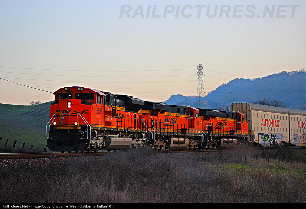 A westbound BNSF vehicle train, the V-BLURIC3-31A, rolls through Franklin Canyon at Christie led by SD70ACe #8527 and ES44C4s #6356 and #6814. The train is an auto extra from Blue Island, IL to Richmond, CA. BNSF SD70ACes are a bit of a rarity in this area as they normally serve on BNSF's coal trains with the SD70MACs.