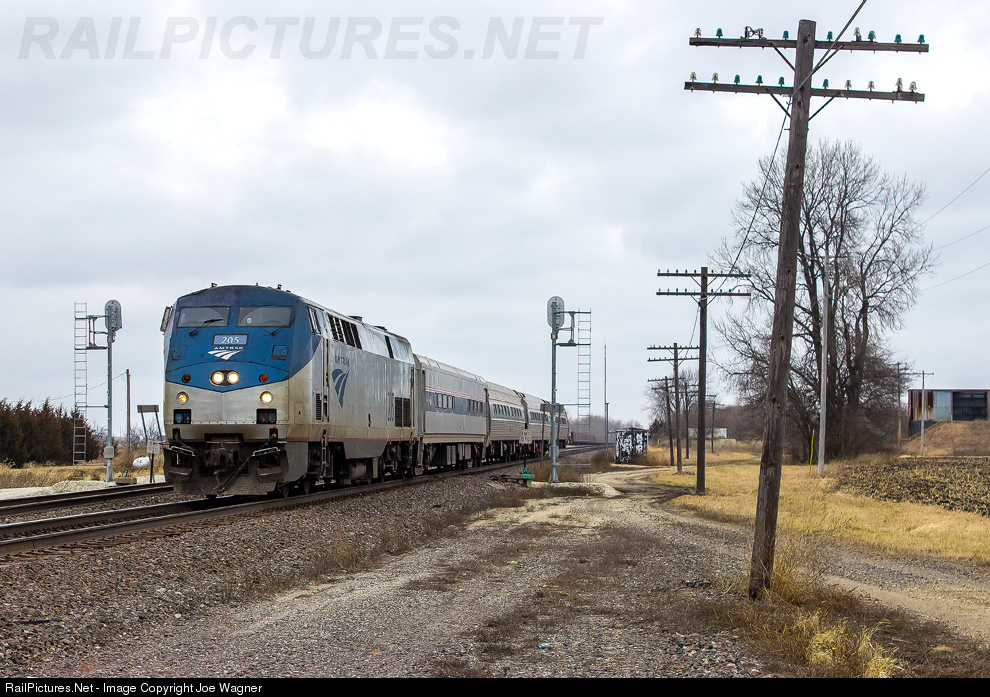 Having just departed the station on-time at Galesburg, Amtrak train #381, the Quincy, IL bound "Carl Sandburg", splits the signals here at MP 168.0X Saluda on BNSF's Brookfield Subdvision during a dismal late-December morning. The train is passing by a row of still standing code-line poles.