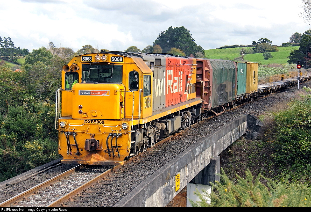 Trains on 3' 6" (1.067m) track from Whangarei to Bluff with virtually heritage rebuilt EMD and GE locomotives still the mainstay power. The network was privatized in 1990's and operated by Toll until 2008 when state owned KiwiRail was established.