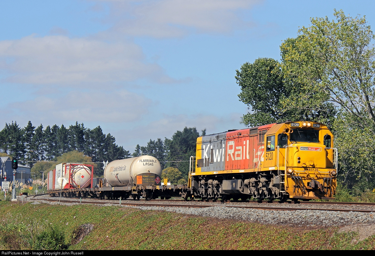 Trains on 3' 6" (1.067m) track from Whangarei to Bluff with virtually heritage rebuilt EMD and GE locomotives still the mainstay power. The network was privatized in 1990's and operated by Toll until 2008 when state owned KiwiRail was established.