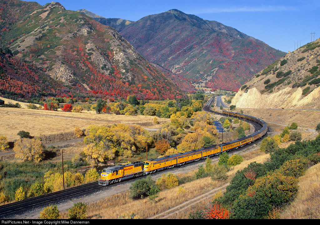 Amid some of Spanish Fork Canyon’s early autumn color, an eastbound Union Pacific Board of Directors special passes through Castilla, Utah, on September 30, 2000. Powering the 15-car passenger train over the grades of Soldier Summit is new EMD SD70M No. 4167 and three E9s.