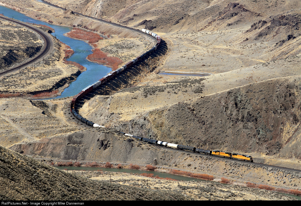 | Snaking along the Humbolt River, an eastbound Union Pacific freight traverses rugged Palisade Canyon, Nevada, on March 7, 2012. |
