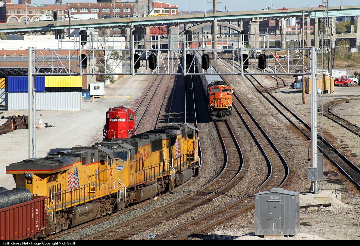 | UP's Council Bluffs-KC freight runs up the KCT as a roadrailer, led by a BNSF ACe waits for the train to clear up at Santa Fe JCT before preceding toward Argentine Yard. The red GP to the left, is CP 4611, Kemper is an unusual spot for a CP motor to be tied down..or any lone power for that matter now. |