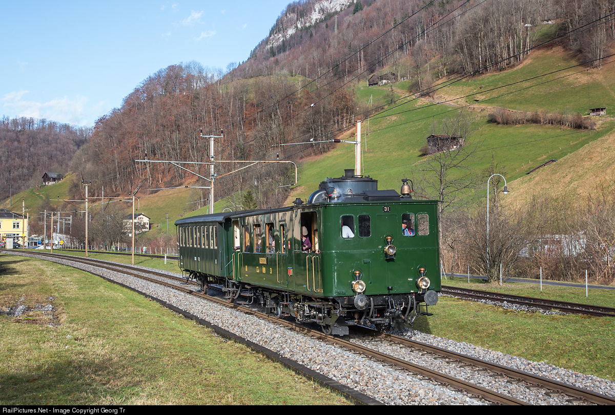 Steam railcar CZm 1/2 # 31 of the former Uerikon-Bauma-Bahn, now with SBB Historic but operated by association Dampfgruppe Zürich, and car C 22 of the former Sihltal Bahn, now operated by Zürcher Museumsbahn (ZMB), on a trip from Zürich to Linthal for the Railway Touring Company from GB. The journey lasted about 6 hours because of several overtakings (max speed of the railcar is 45 km/h) and taking of water, the regular train S 25 needs about 1 1/2 hour for the same trip. 4 1/2 hour after the start in Zürich the train is reaching Glarus, where the railcar was turned on the turntable.
