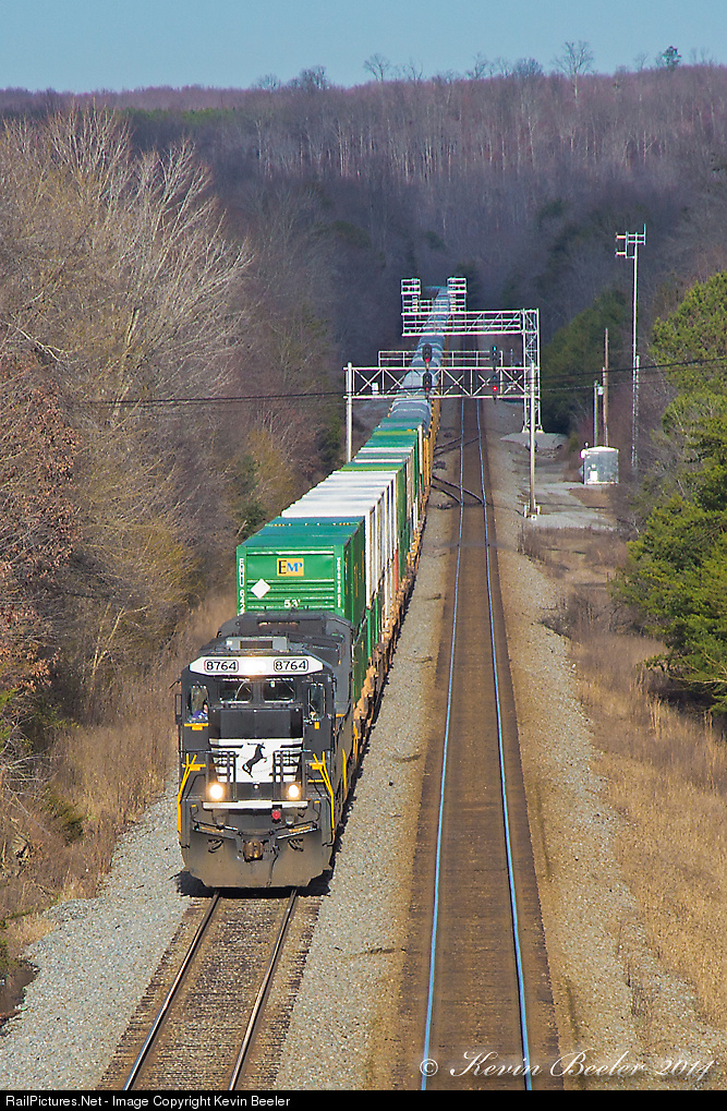 With a clear signal in the distance for an approaching northbound (that would show up just moments later), southbound rack/stack train 223 has just passed the crossovers at CP Sunbright on the Rathole.