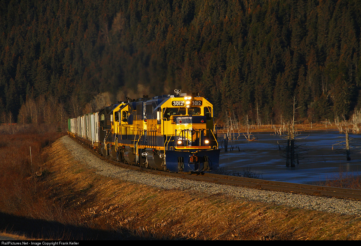 | In what's decidedly a very non-winters view 3012, the newest painted unit on the roster, leads 3 sisters south as they enter 20 Mile Valley near Portage en-route to Whittier and a date with the ARMs Barge. The first couple of days of 2015 were very nice and hopefully a sign of things to come. |