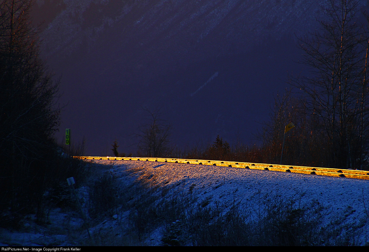 | Although the winters are long and often difficult from both a weather and a train perspective there are benefits. One such benefit is that you do not have to drag yourself out of bed at an early hour to see the sunrise as seen here with this shot of first light at MP 100 around 1130 AM. |