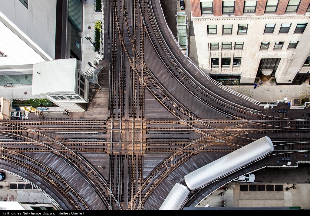 Looking down on the junction at the intersection of Lake and Wells Streets in Downtown Chicago.