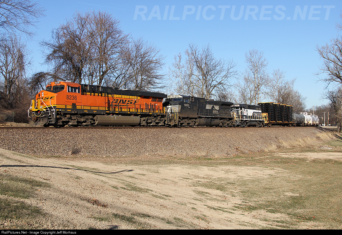 BNSF 8236, NS 9953 and GM&O (VLIX) 631 creeps along through Belleville, Illinois. Gulf Mobile & Ohio GP35 #631 is on it's trek west to Kansas City, Missouri from the Southern Appalachia Railway Museum in Oak Ridge, TN. VLIX #631 should be set out in Norfolk Southerns Moberly, Misssouri yard where NS train 33J will pick it up and deliver it to the Union Pacific in Kansas City.