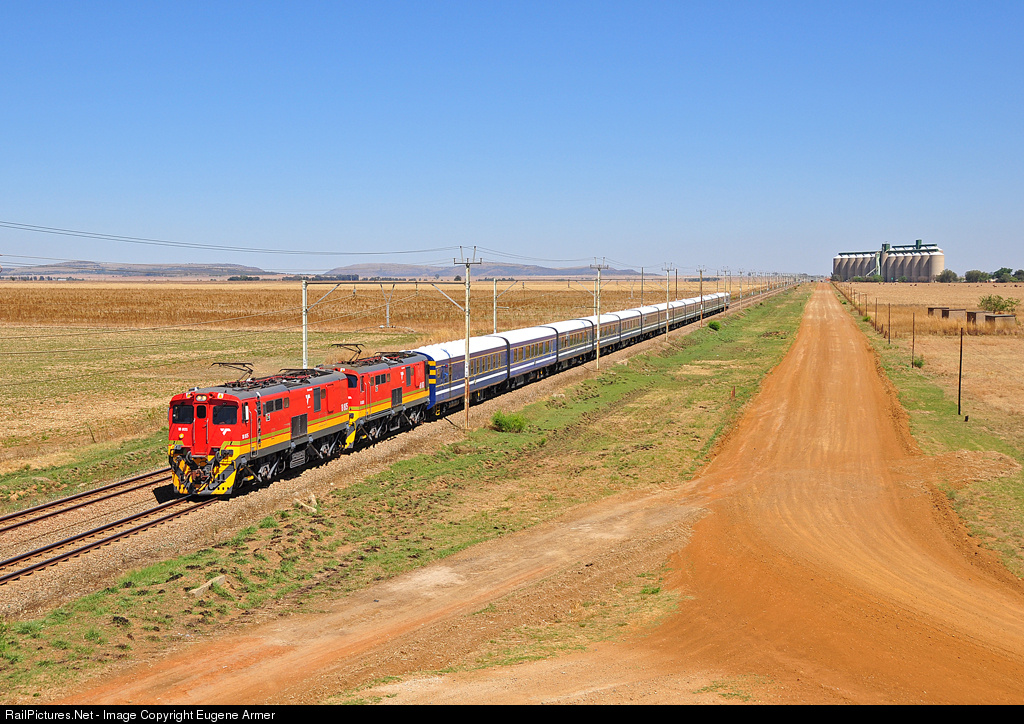 On a clear and sunny spring morning, with some greenery evident after the first spring rains, the luxury Blue Train is passing Raathsvlei, as it travels over the link line from Potchefstroom to Houtheuwel, near Vereeniging. From there it will head up through Redan and Meyerton to Germiston and then on to Pretoria. This is Blue Train set no. 2, which is 14 coaches in length and carries 52 passengers. Since the dual voltage class 14E's were withdrawn from Blue Train service, classes 18E (3kV DC) and 7E (25kV AC) have taken over. More recently, the 18E's allocated to work these trains have been the newer locomotives wearing the TFR red livery, such as these two from the 800 series.