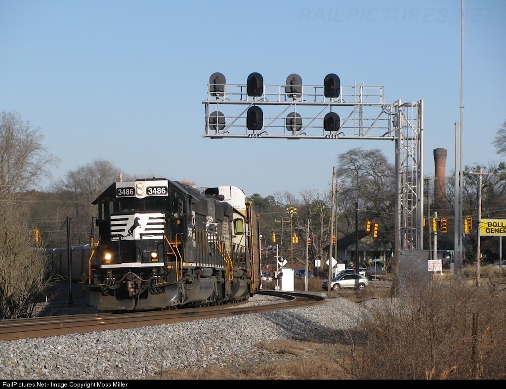 | Norfolk Southern Piedmont Division local train P79 makes its way underneath the overhead signals at Arcadia headed southbound. The local will teminate at the BMW plant in Greer and will also work the SC Inland Port. |