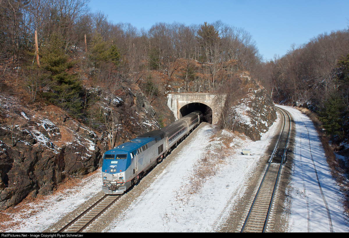 A southbound Empire Service train exits the tunnel at Metro-North's Garrison station.