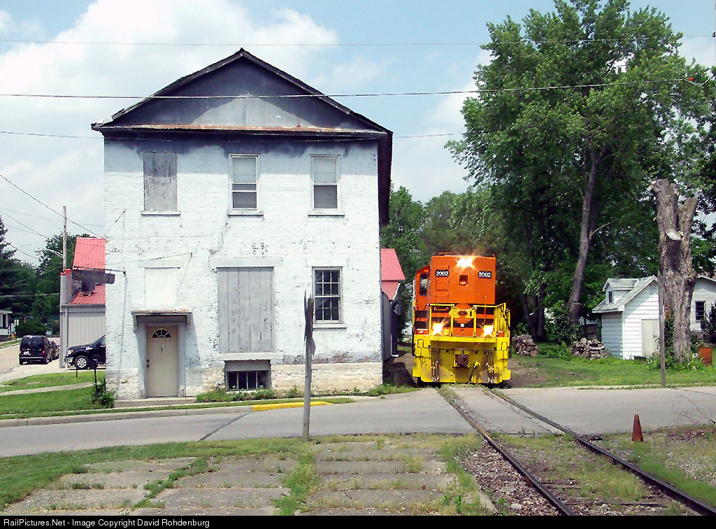 | CIND 2002 and the I&O Brookville Local slowly threads its way along some rickety track and past an old home in the small Indiana/Ohio border town of West Harrison, Indiana. Just one block to my right is the Ohio border and the town of Harrison, Ohio. The engine is leaning a bit due to the nature of the ancient branchline trackage they are running on. |