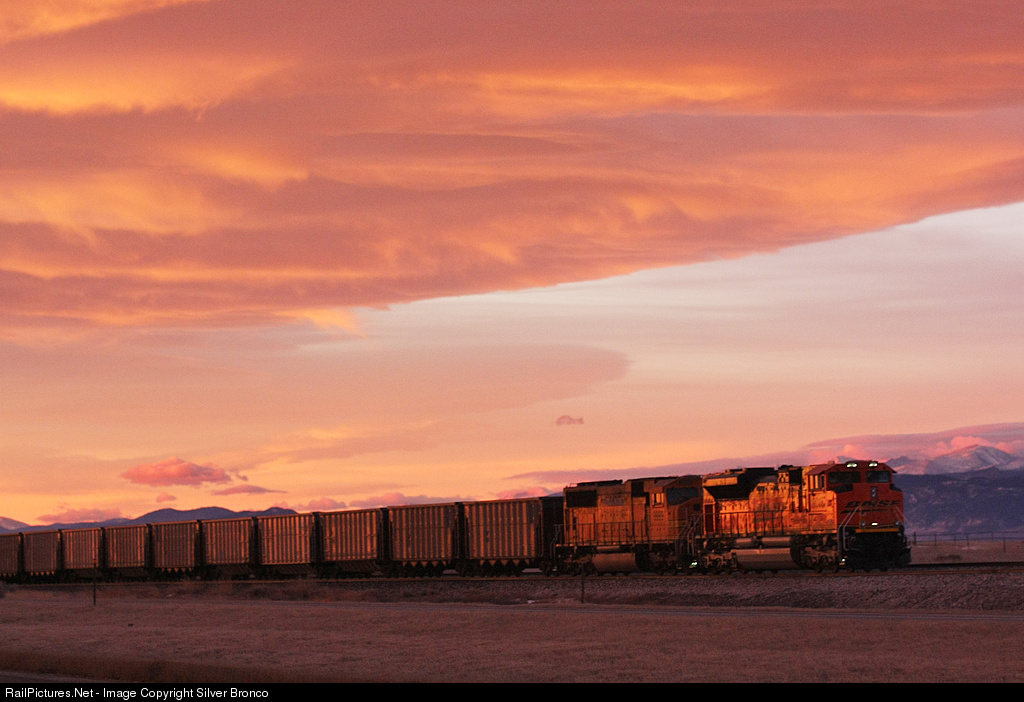 Empty coal headed up the BNSF Front Range Sub pauses on Owl Creek Siding during a fiery Colorado sunrise. Incidentally, unit #2 here is BNSF 9999, an SD70MAC.