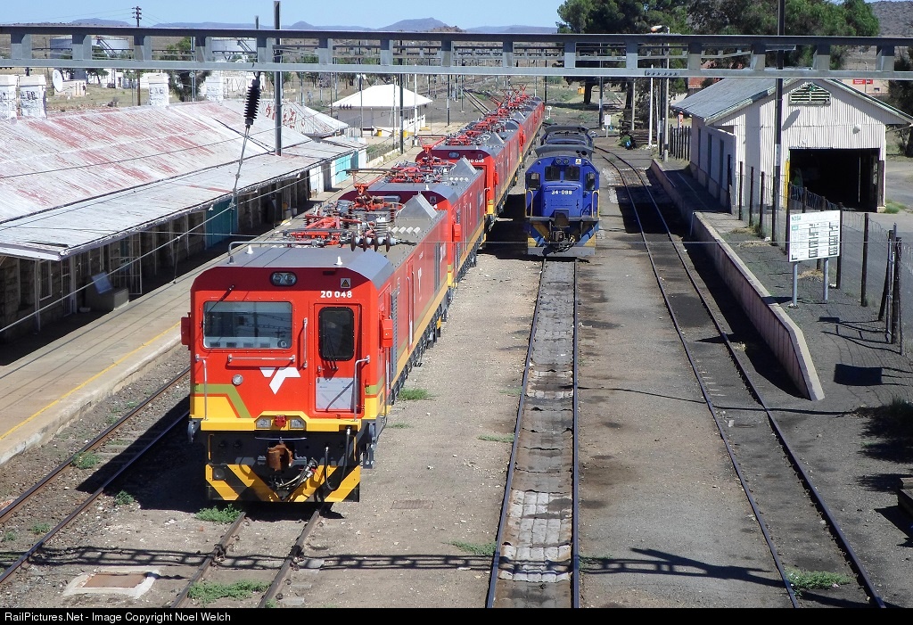 Local production of the "China Dolls" at Koedoespoort in Pretoria is in full swing! Class 20E, 20 048, heads the ready line at Rosmead Station in the Eastern Cape in the morning sunlight. The Class 34 diesel locomotives, with 34-088 in front, standing on the adjacent line look rather inconspicuos next to the China Dolls!