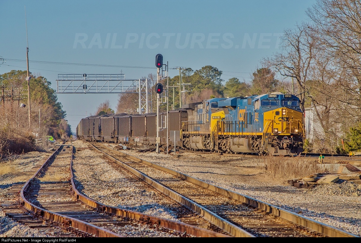 A shorter than usual string of coal cars, but still fairly long, at 100 cars, are seen passing under the HRT signals, leading into the Newport News Yard, going from the main track, to track number 4. The conductor is just out of frame at right inspecting the path, making sure that all switches are lined for their move.