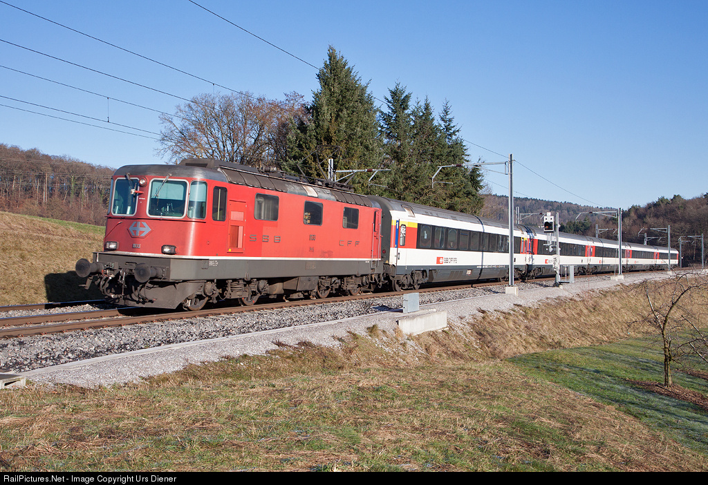| The former Swiss Express Re 4/4 II 11133, which has still the SBB symbol on the front, is pulling IC 181 to Zürich. |
